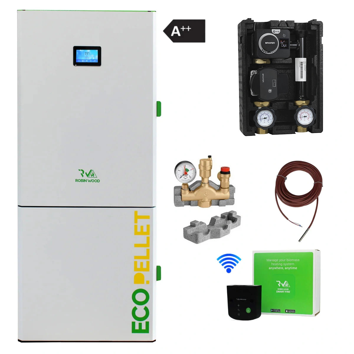 ✓ A++ Robin Wood EcoPellet Pelletkessel (Leistung nach Wahl) mit Rücklaufanhebung, Pufferfühler und Wlan-Modul für die Robin Wood Smartfire App zur Überwachung Ihrer Pelletheizung