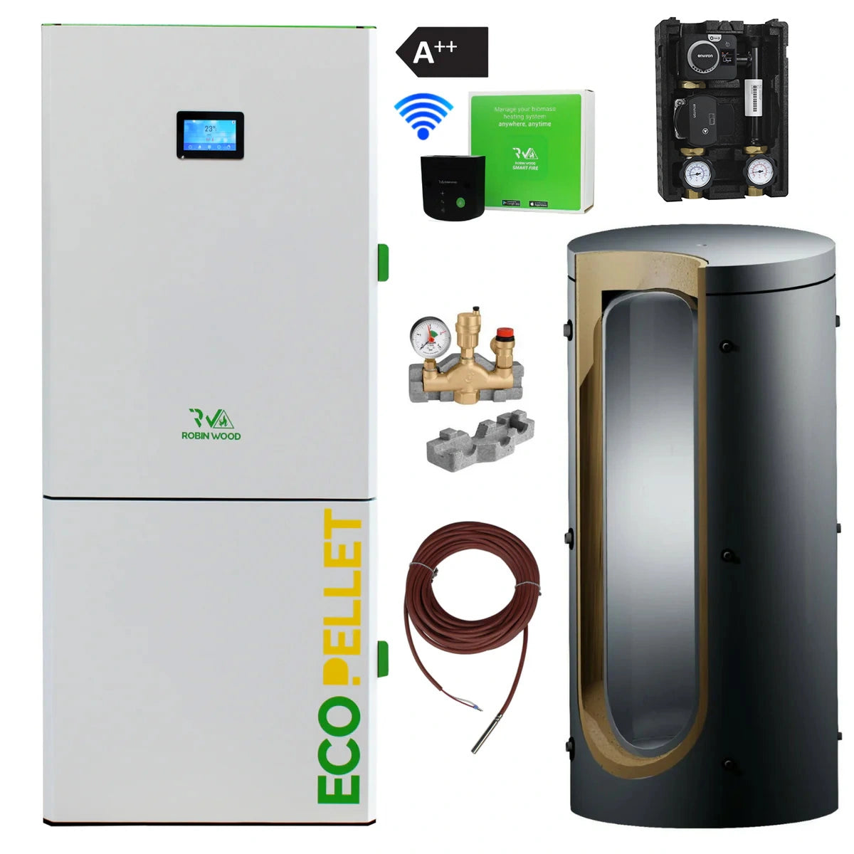 ✓ A++ Robin Wood EcoPellet Pelletkessel (Leistung nach Wahl) mit Pufferspeicher, Rücklaufanhebung, Pufferfühler und Wlan-Modul für die Robin Wood Smartfire App zur Überwachung Ihrer Pelletheizung