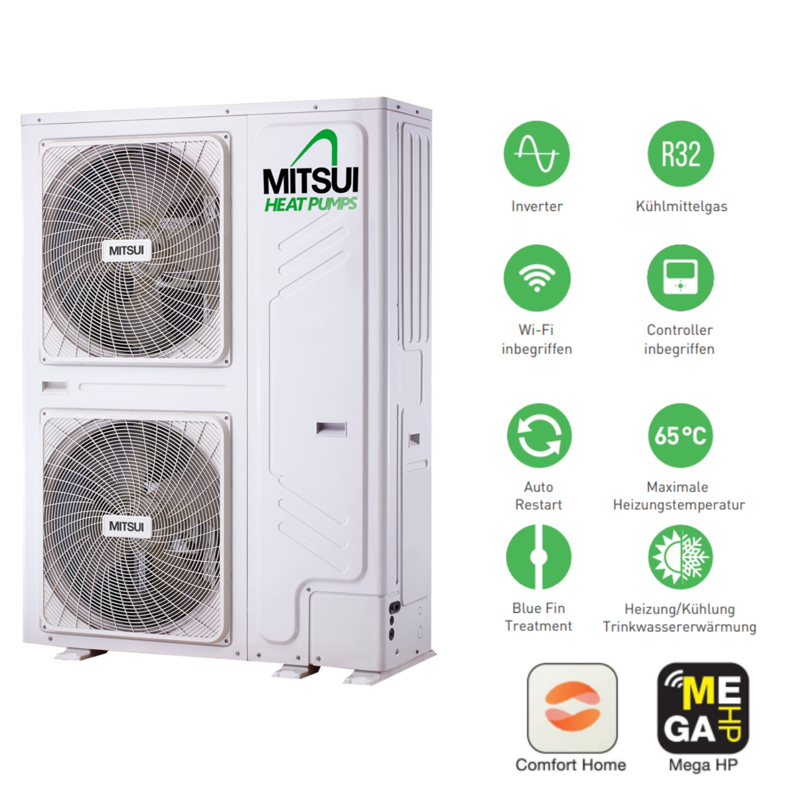 ✓ Mitsui bietet zwei Produktlinien mit Wärmepumpen, jeweils zum Heizen und zur Warmwasserbereitung, an: Die Linie mit Monoblockgeräten und die Linie mit Splitgeräten. Beide Linien gehören der Klasse A++ (siehe Europäische Gesetzgebung zur Energieeffizienz) an und tragen wesentlich zur Einschränkung der Umweltbelastung bei, wodurch erhebliche Energieeinsparungen und eine Senkung der Betriebskosten erzielt