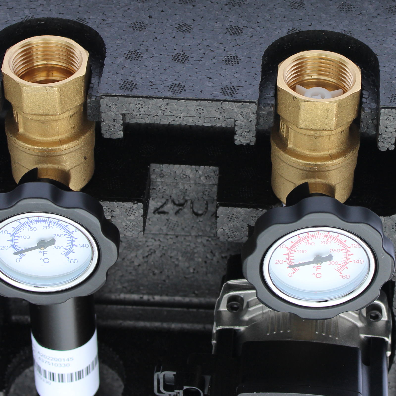 Im oberen Bereich der Pumpengruppe befinden sich flachdichtende Absperrventile (1“ IG) mit eingebauten Thermometern (0-160°C). Falls die Pumpengruppe einzeln verbaut wird, kann an den Absperrventilen eine Wandhalterung verschraubt werden (nicht im Lieferumfang enthalten).