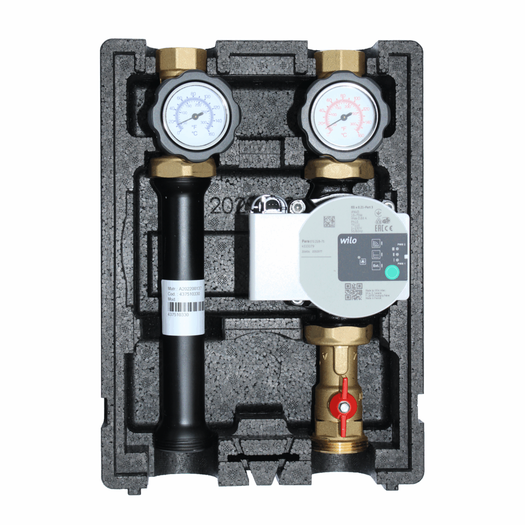 Im oberen Bereich der Pumpengruppe befinden sich flachdichtende Absperrventile (1“ IG) mit eingebauten Thermometern (0-160°C). Falls die Pumpengruppe einzeln verbaut wird, kann an den Absperrventilen eine Wandhalterung verschraubt werden (nicht im Lieferumfang enthalten). Wartung oder Austausch der Umwälzpumpe ist sehr einfach, ohne dass die Anlage entleert werden muss.