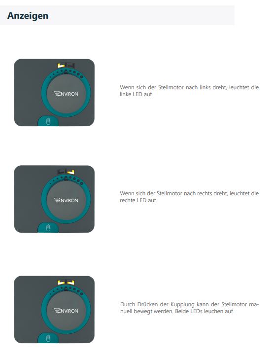 Der ENVIRON Stellmotor END05 mit 3-Punkt-Regelung dient der Positionsregelung von Drehmisch- und Kugelventilen. Er zeichnet sich durch robuste Bauweise und einen leisen Betrieb aus. Ausgestattet mit dem ENVIRON EASY CLICK System, kann der Mischermotor mit einem “Klick” auf dem Mischer montiert und demontiert werden, ohne dass Werkzeuge benötigt werden. Durch Drücken der Kupplungstaste können Sie den Drehknopf manuell bedienen. Die Drehrichtung sowie die Aktivierung des Handbetriebes werden mit LED-Leuchten signalisiert.