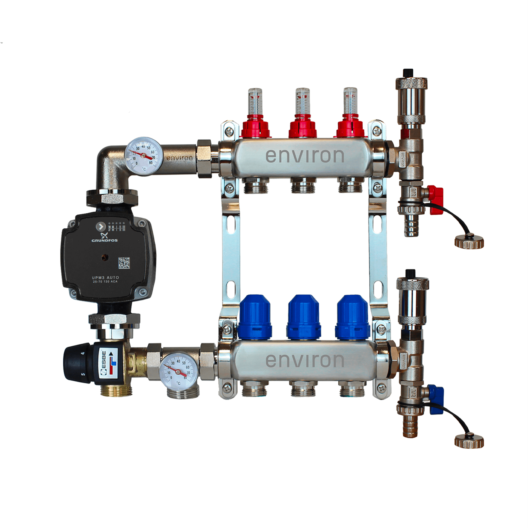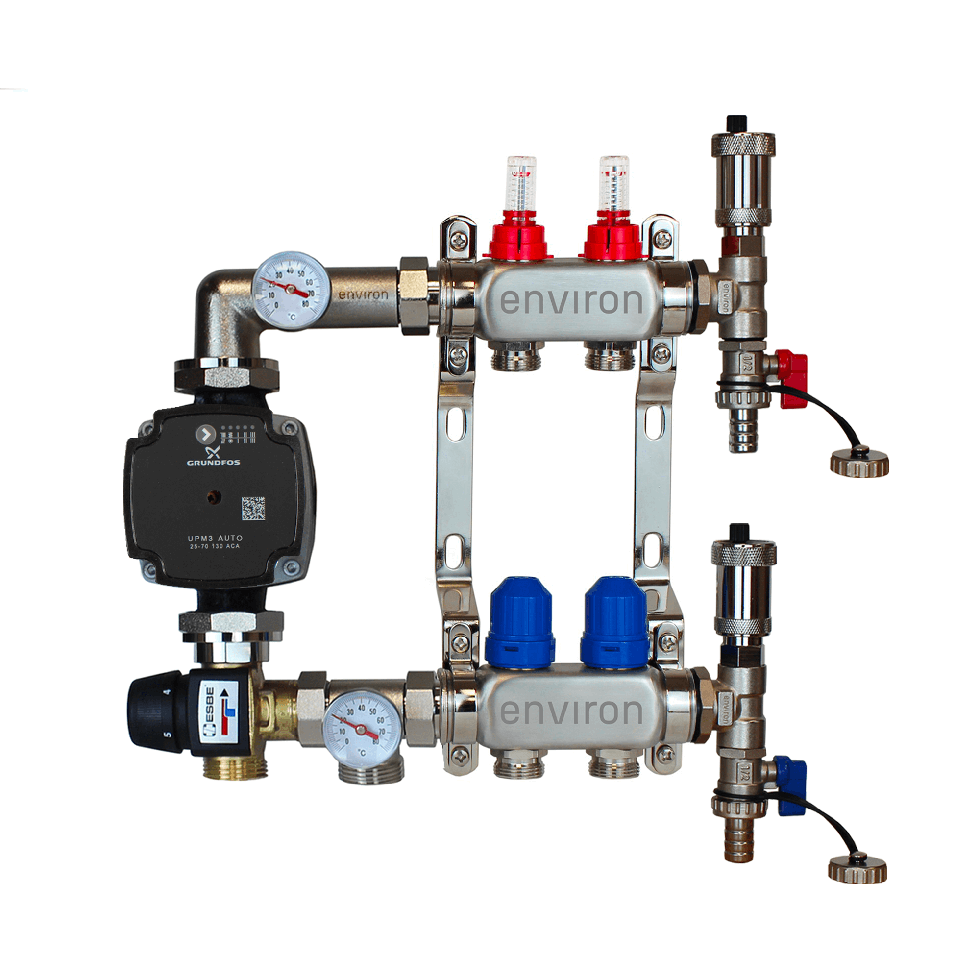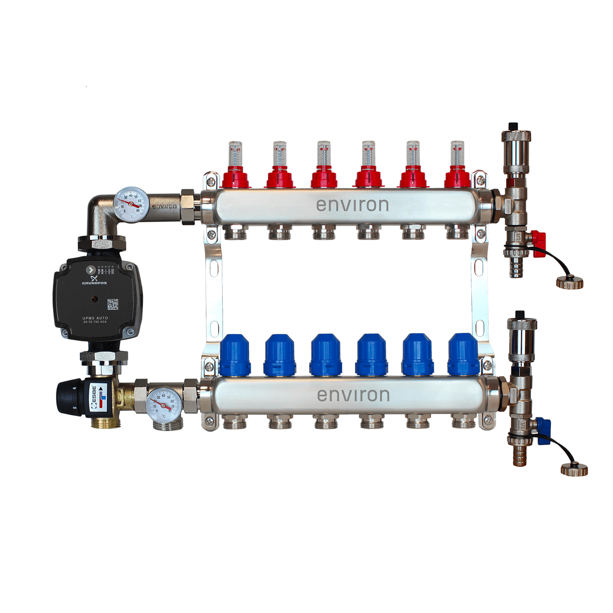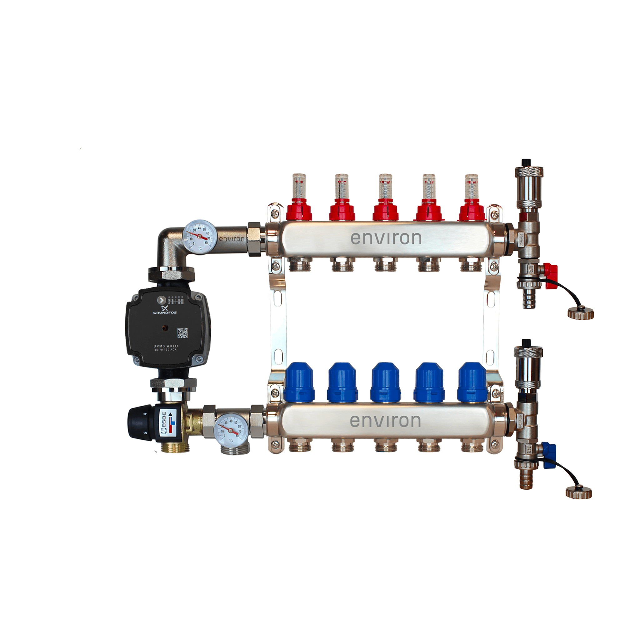 Leistung: 1″ Edelstahl-Heizkreisverteiler + Festwertregelset & Hocheffizienzpumpe – ideal für mehrere Fußbodenheizkreise und konstante Vorlauftemperaturen