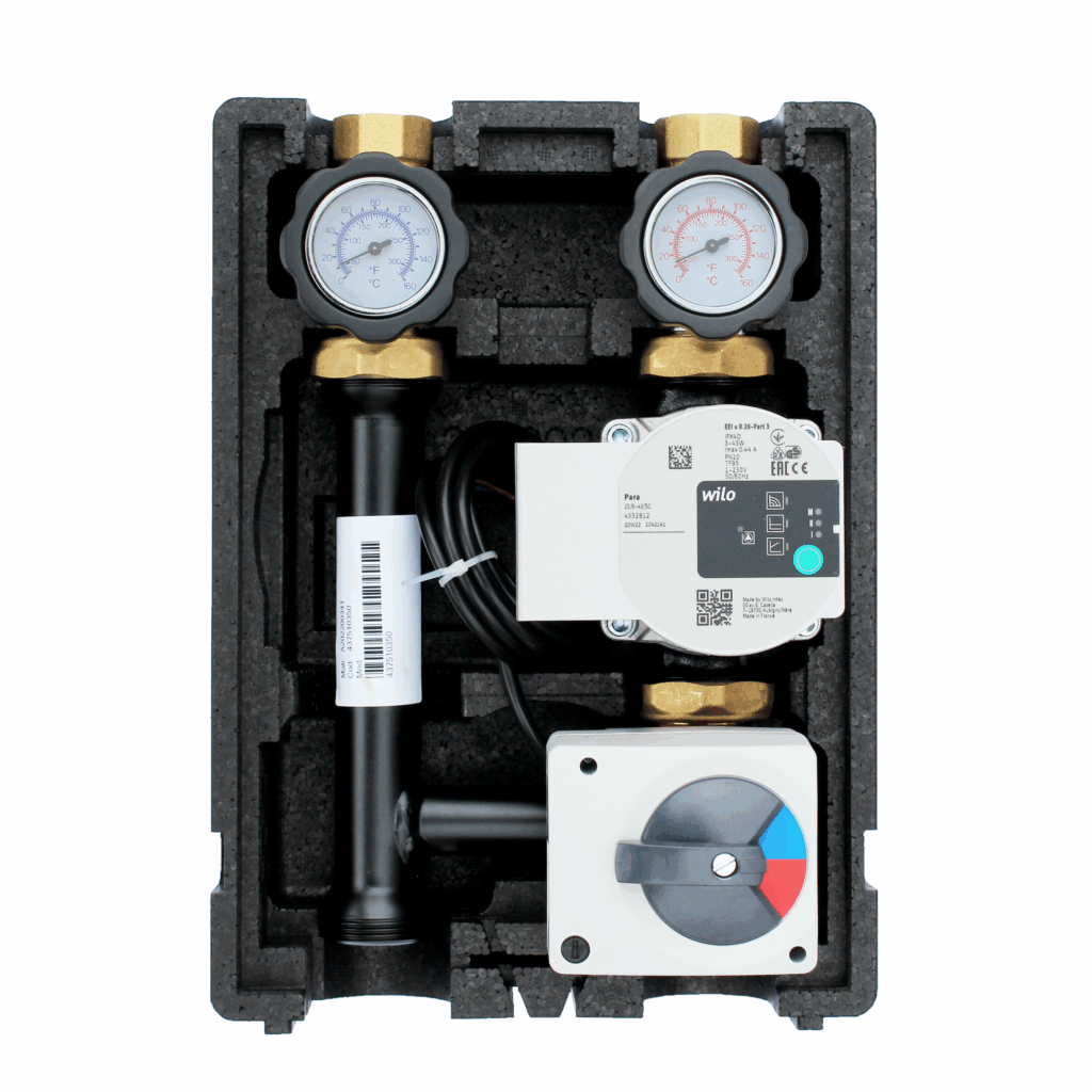 Im oberen Bereich der Pumpengruppe befinden sich flachdichtende Absperrventile (1“ IG) mit eingebauten Thermometern (0-160°C) und integrierter Schwerkraftbremse im Vorlauf. Falls die Pumpengruppe einzeln verbaut wird, kann an den Absperrventilen eine Wandhalterung verschraubt werden (nicht im Lieferumfang enthalten). Wartung oder Austausch der Umwälzpumpe ist sehr einfach, ohne dass die Anlage entleert werden muss. Der Achsabstand beträgt 125mm und die Abmessung der unteren Anschlüsse 1½“ AG für eine möglichen direkten Einbau auf einen herkömmlichen Verteilerbalken.