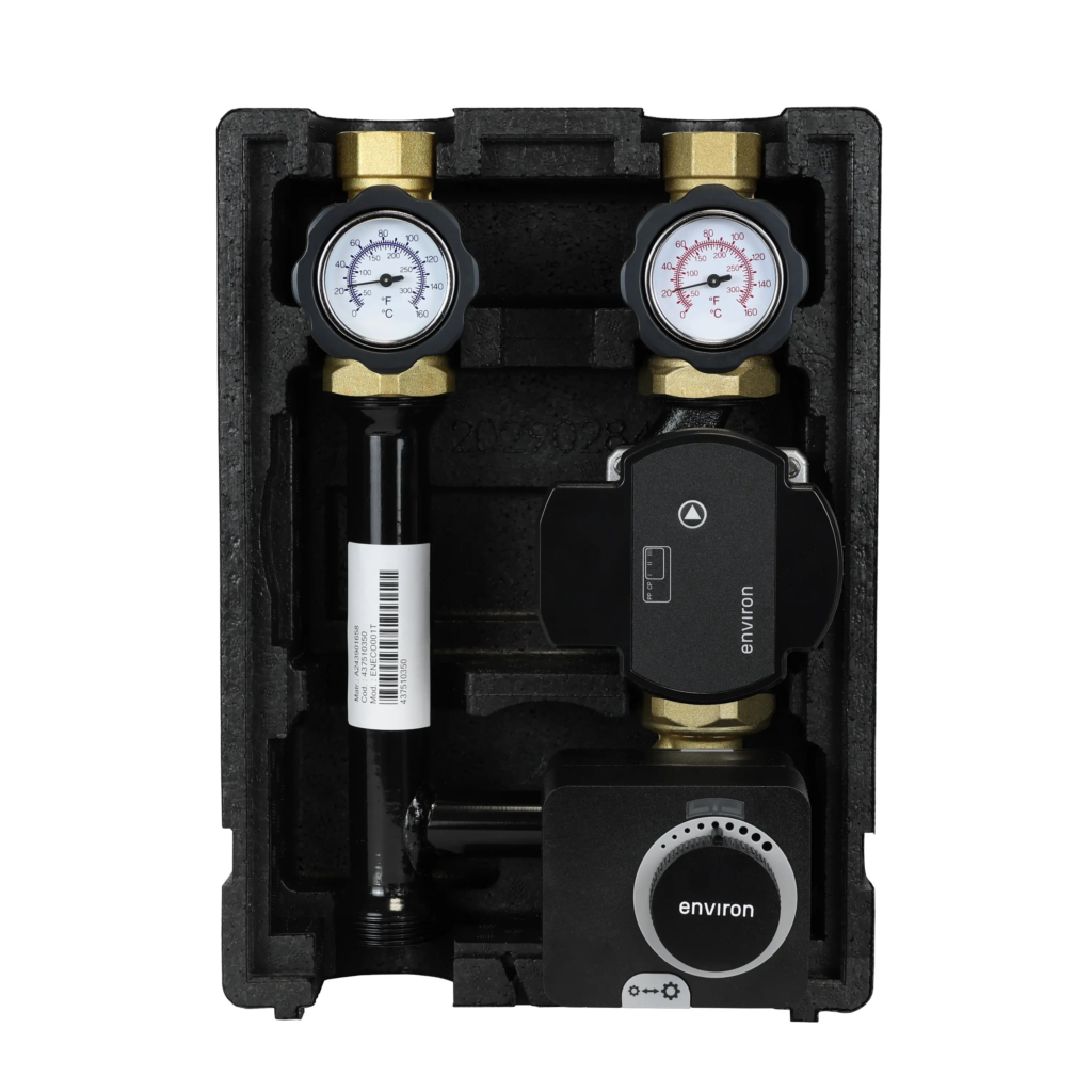 Die Pumpengruppe PROFI MIX EN001 ist eine einbaufertige, professionelle Pumpengruppe für Heizkreise wie Fußbodenheizung, Wandheizung, Radiatoren usw. mit eingebauten Drei-Wege-Mischer aus Messing und einem Environ Stellmotor. Verbaut ist eine Environ EcoStar 25/6 , 180mm Hocheffizienzpumpe (BAFA förderfähig).