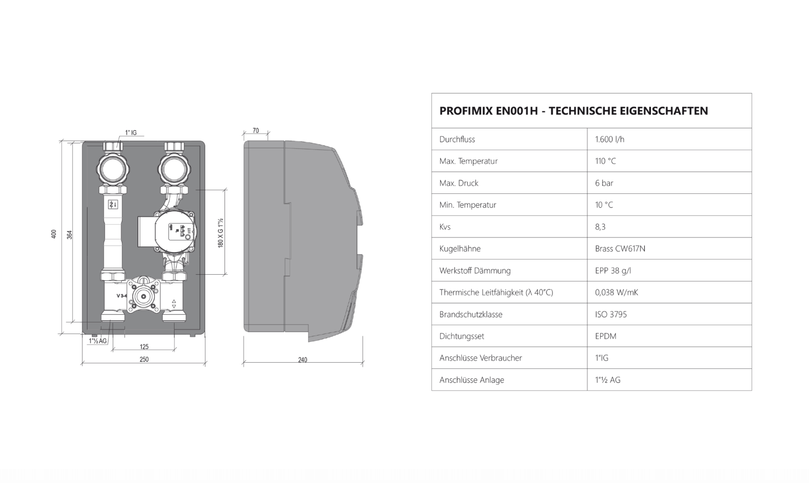 Die Pumpengruppe ProfiMix EN001 ist eine einbaufertige, professionelle Pumpengruppe für Heizkreise wie Fußbodenheizung, Wandheizung, Radiatoren usw. mit eingebauten Drei-Wege-Mischer aus Messing und einem Environ END05 Stellmotor. Verbaut ist eine Wilo Para STG 25/8,75, 180mm Hocheffizienzpumpe (BAFA förderfähig). Vor- und Rücklauf können einfach von rechts nach links umgekehrt werden. Im oberen Bereich der Pumpengruppe befinden sich flachdichtende Absperrventile (1“ IG) mit eingebauten Thermometern (0-160°C) und integrierter Schwerkraftbremse im Vorlauf.