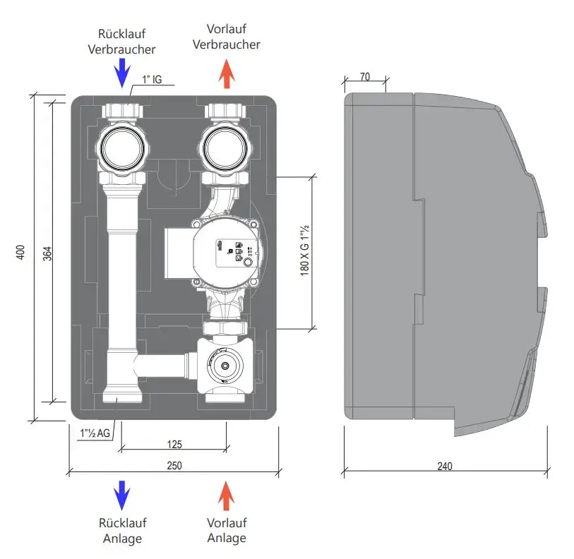 Leistung: Durchfluss bis 1.600 L/h, optimal für Fußbodenheizung, Wandheizung und Radiatoren; Achsabstand 125 mm und 1½“ AG für direkten Verteileranschluss
