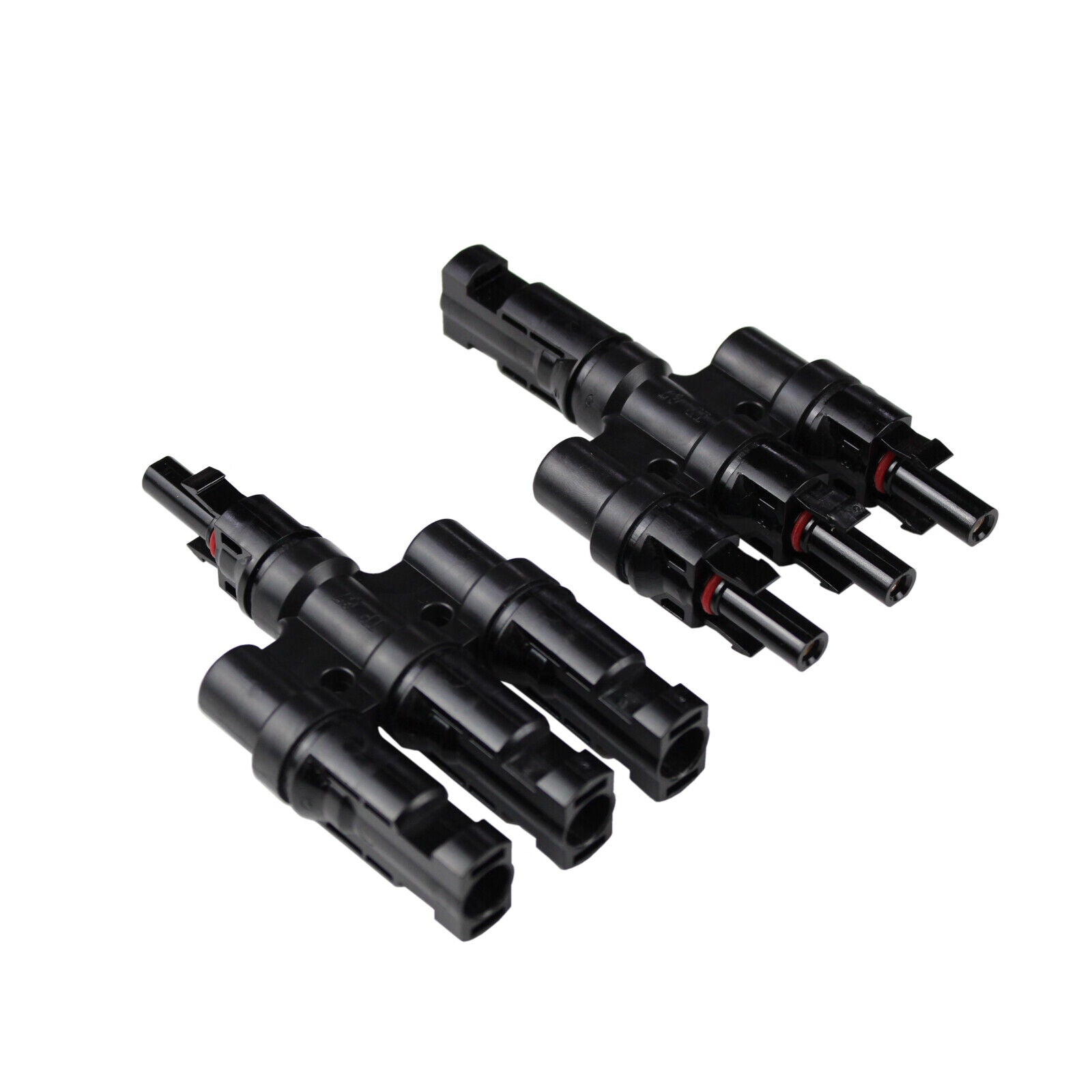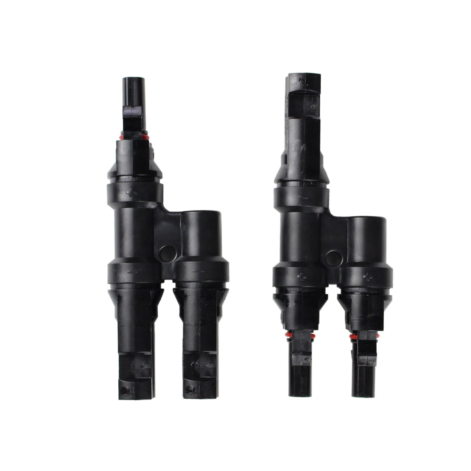 Satz „+“ und „-“ Stecker (männlich und weiblich). Das Set ist für die Verwendung an einem Solarkabel konzipiert. Mit Steckverbindern werden Solarpanele mit Solarkabeln verbunden.