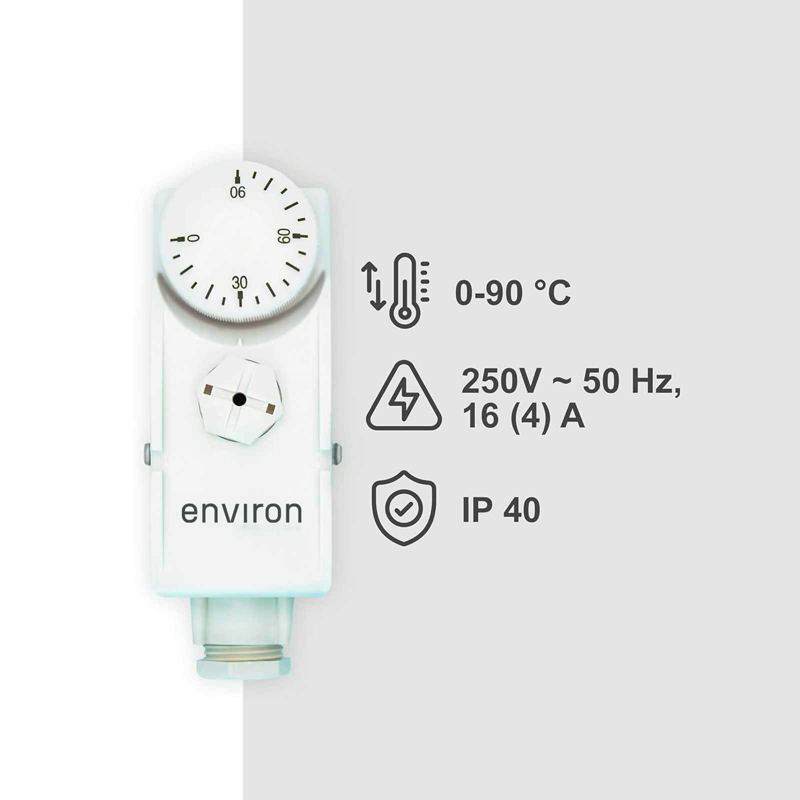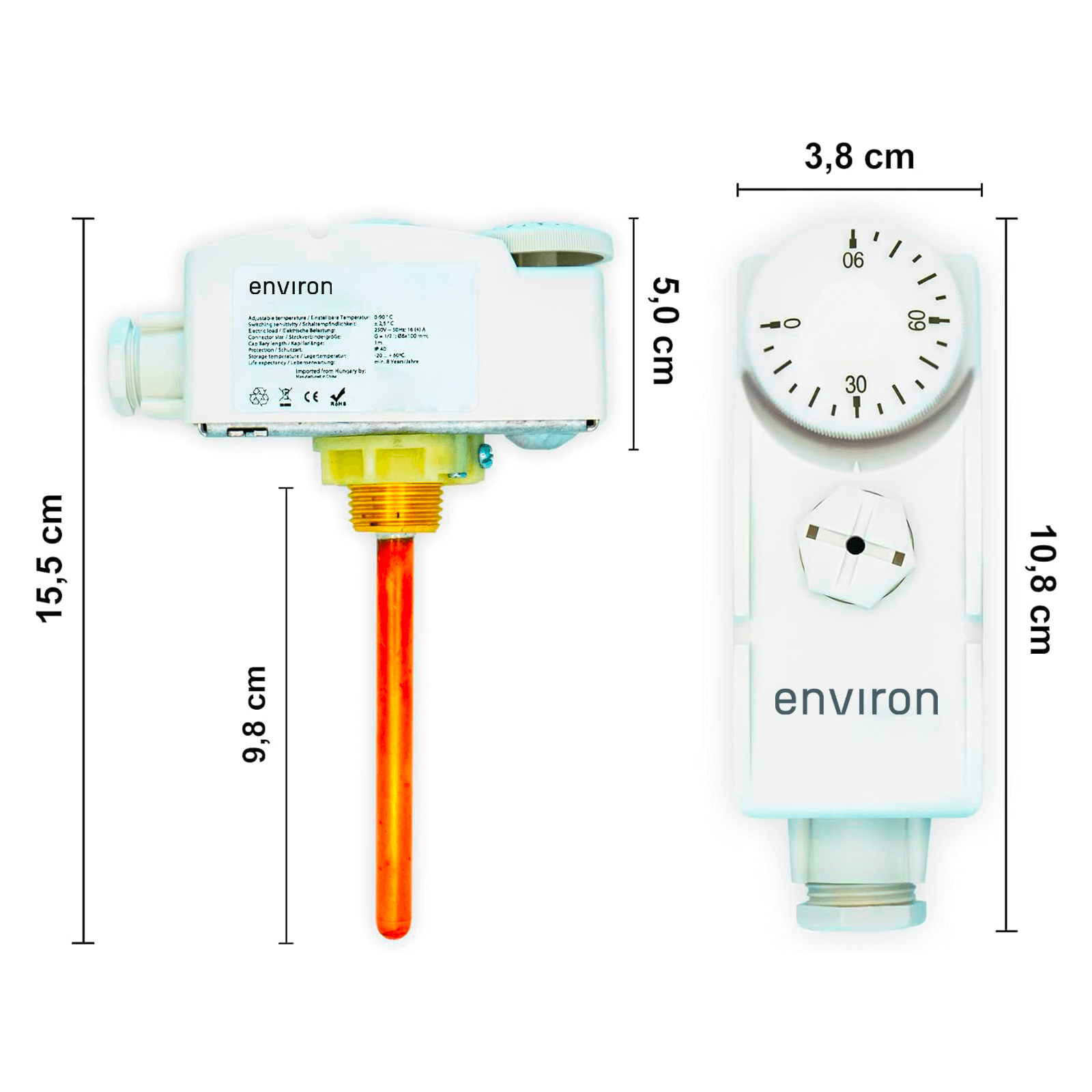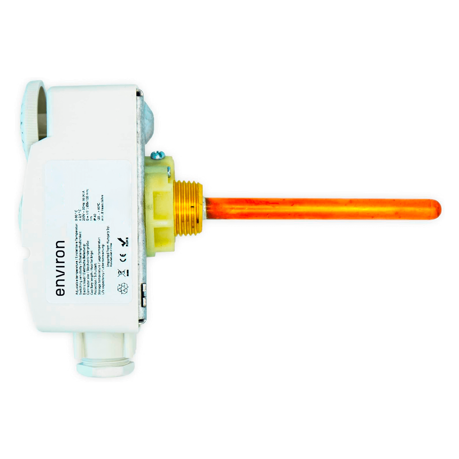 Entdecken Sie den Environ Tauchthermostat mit einem Regelbereich von 0 bis 90°C und einer praktischen Tauchhülse 100mm für einfache Montage. Dieser Thermostat ist mit einem Wechsler ausgestattet, der als Öffner oder Schließer verwendet werden kann und gewährleistet bei drohender thermischer Überlast eine sichere Unterbrechung des Stromkreises. Seine robuste Konstruktion und das Elastikspannband ermöglichen eine sichere Befestigung an Rohren.