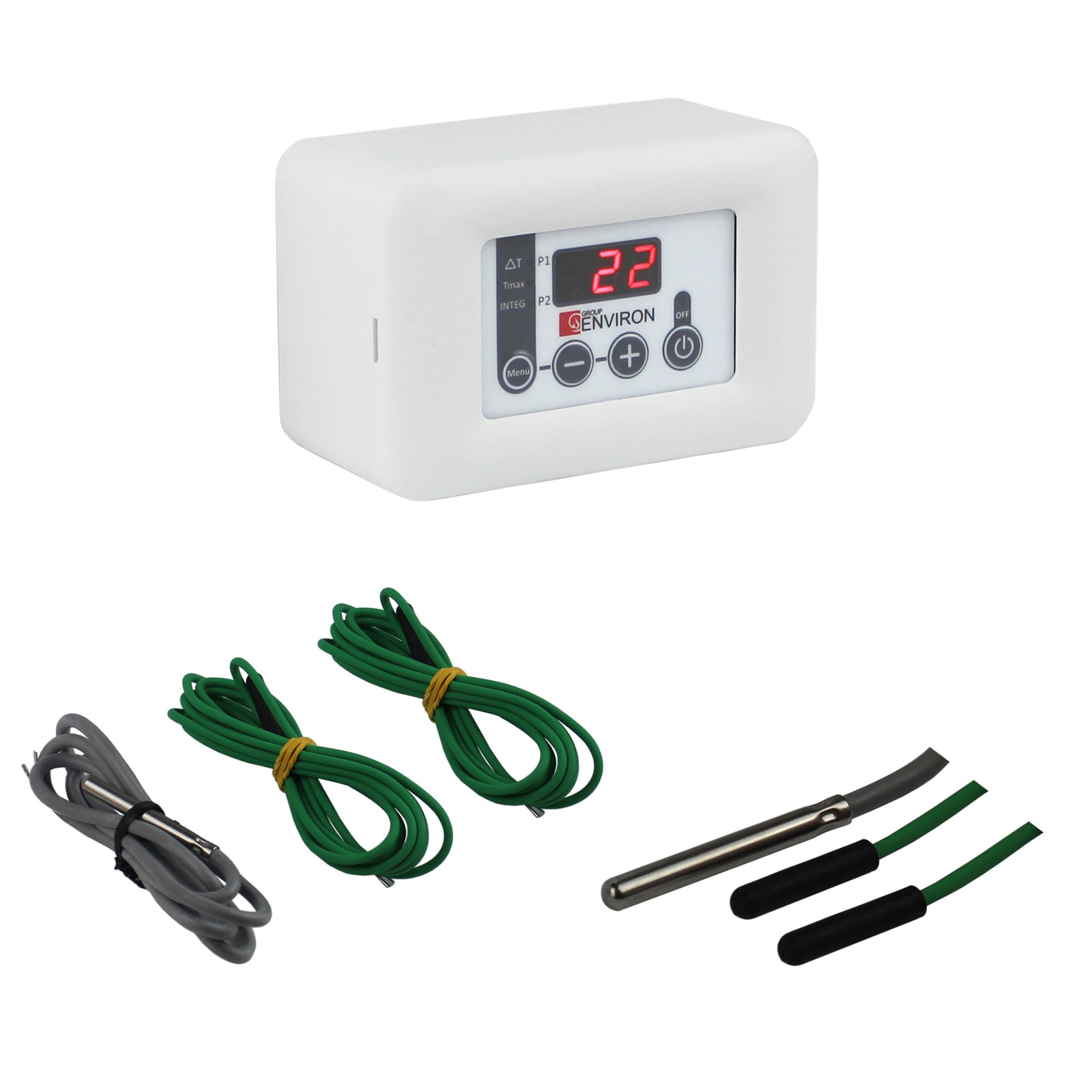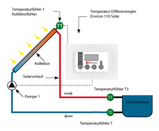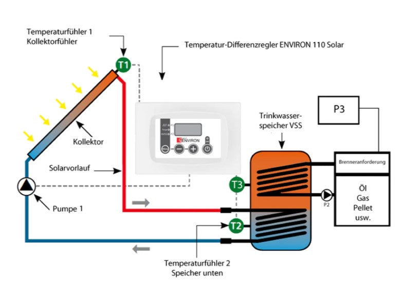 Der Regler verfügt über drei Eingänge zur Temperaturerfassung und zwei Ausgänge zur Ansteuerung der Solarkreispumpe und zur Anforderung eines zweiten Wärmeerzeugers. Die Ausstattung des Environ TC110 Solar wird durch zahlreiche Zusatzfunktionen, wie die Speichermaximaltemperatur und Frostschutzfunktion ergänzt.