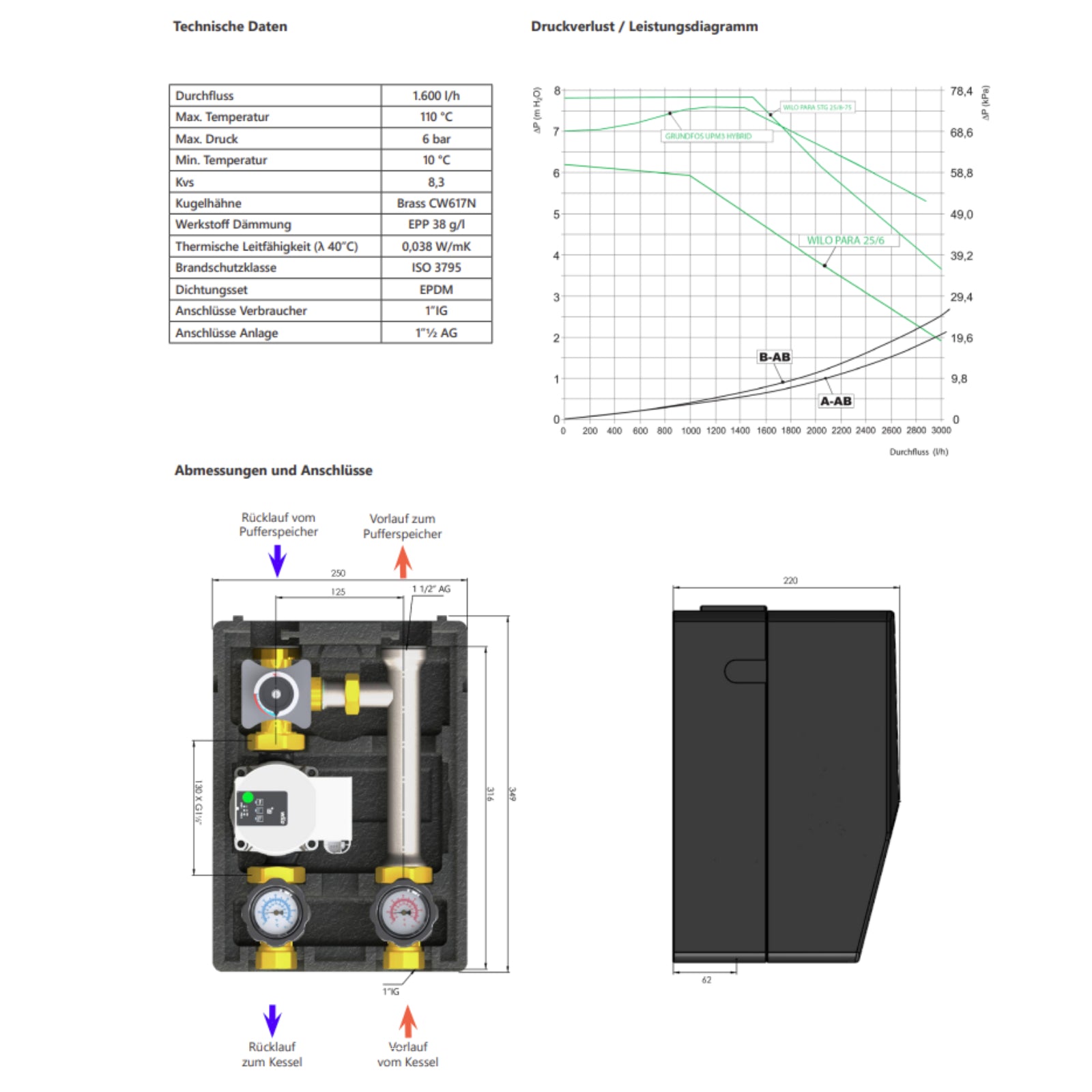 Installation & Design: kompakte Bauweise, hochwertige Materialien Made in Germany, EPP-Dämmung (ISO 3795), 1″ IG / 1½“ AG Anschlussmaße – schnelle und sichere Montage