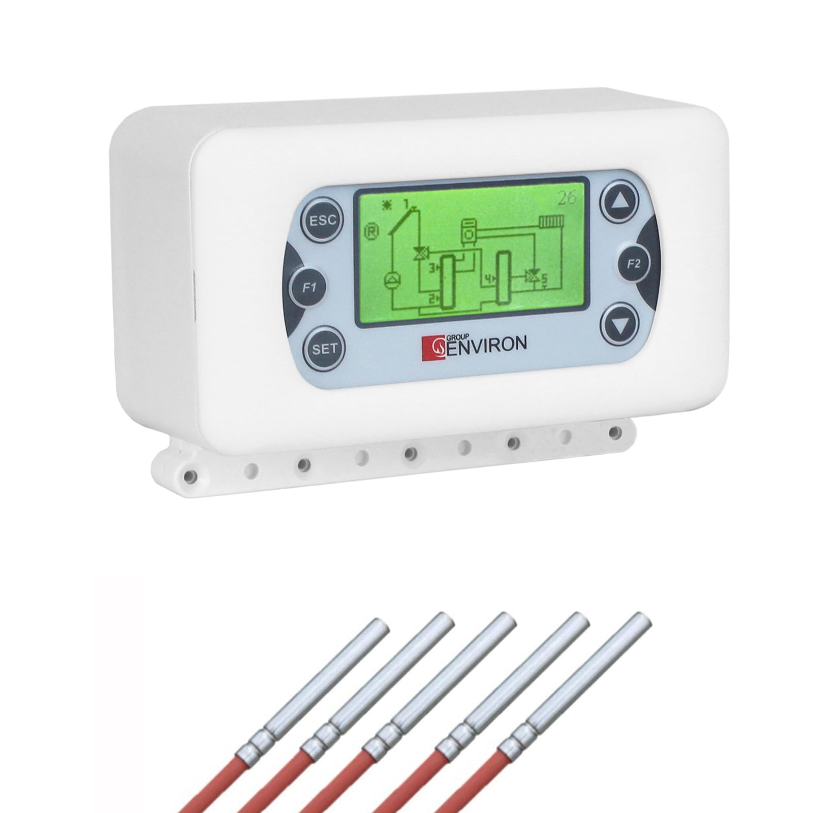 Der Solar-Regler ENVIRON TSol500 Platinum bietet alles, was Ihre thermische Solaranlage zum sicheren und dauerhaften Anlagenbetrieb benötigt sowie eine intelligente Beladung (Schichtung) von Wärmespeicher und Schwimmbäder eine intelligente Integration von anderen Wärmeerzeugern (z.B. Pelletkessel, Gaskessel usw.) Sie können zwischen 27 verschiedenen Anlageschemen auswählen. Neben der Solaranlagensteuerung übernimmt der Regler auch wichtige Anlagenüberwachungs- und Sicherheitsfunktionen. Anlagenparameter und Messwerte können über das LCD-Display betrachtet und verändert werden. Der Regler verfügt über fünf Temperaturfühler Pt1000 zur Temperaturerfassung und fünf Ausgänge zur Ansteuerung der Solarkreispumpe, Brenneranforderung, Drei-Wegeventil und vieles mehr (siehe Anlageschemas).