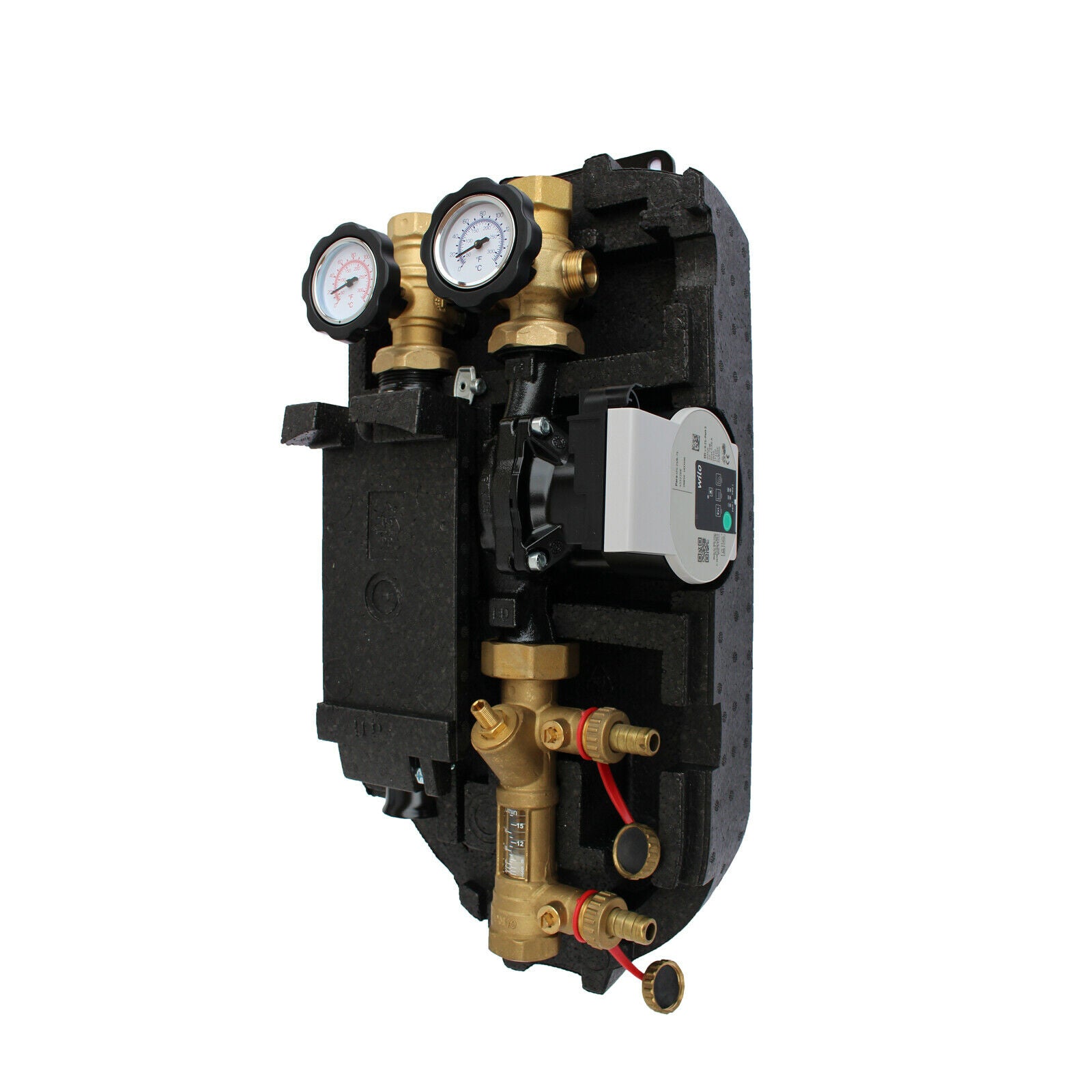 Hochwertige Absperrventile mit eingebauter Schwerkraftbremse und Thermometern. Komplett Anschlussfertig mit Wärme-Dämmschale aus EPS.